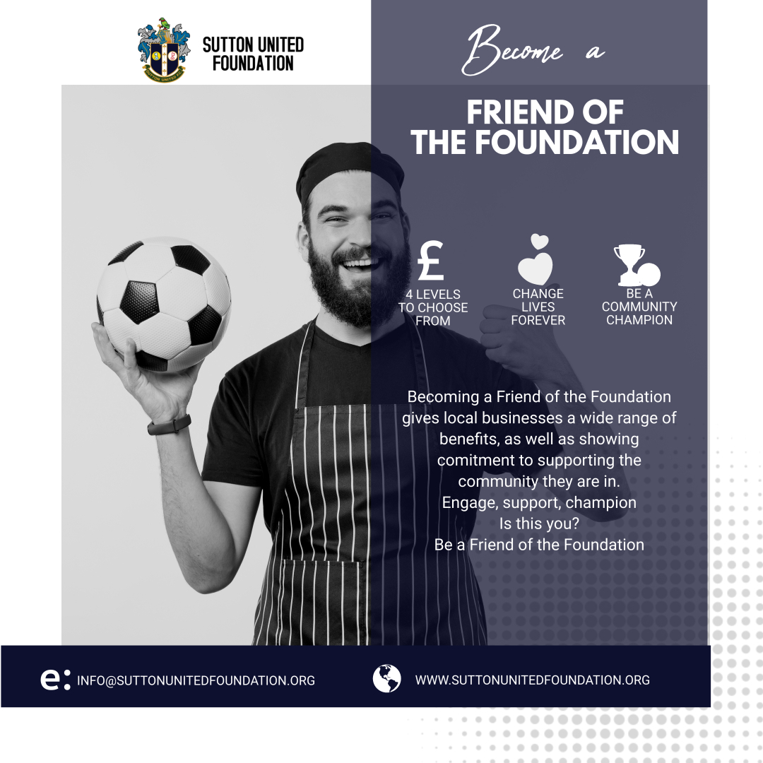 The Sutton United Foundation vision is to enable all businesses to support their local community in a fun, engaging way. Becoming a Friend of the Foundation gives local businesses a wide range of benefits, as well as helping each one to reach new areas of the community and help us to improve local lives. There are 4 affordable levels - Just click the image above for details.