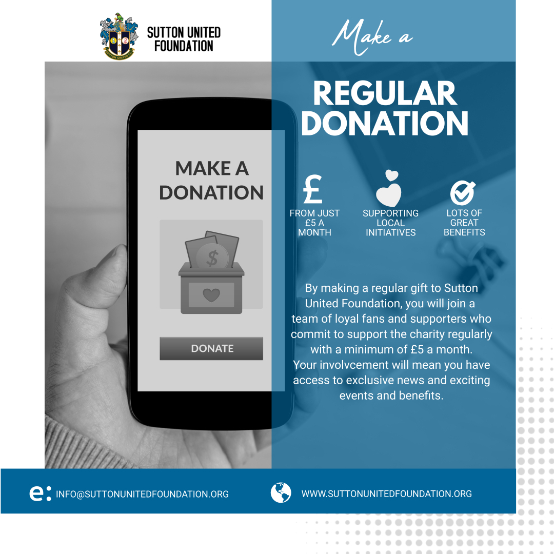 By donating to Sutton United Foundation monthly, from as little as £5, you will join a group of local people and players supporting the charity's work in the Sutton community. In turn you will receive invites to unique stadium and community events, other activities along with regular updates on our work. You will be joining an amazing group of people who support the community of Sutton through our outreach work.