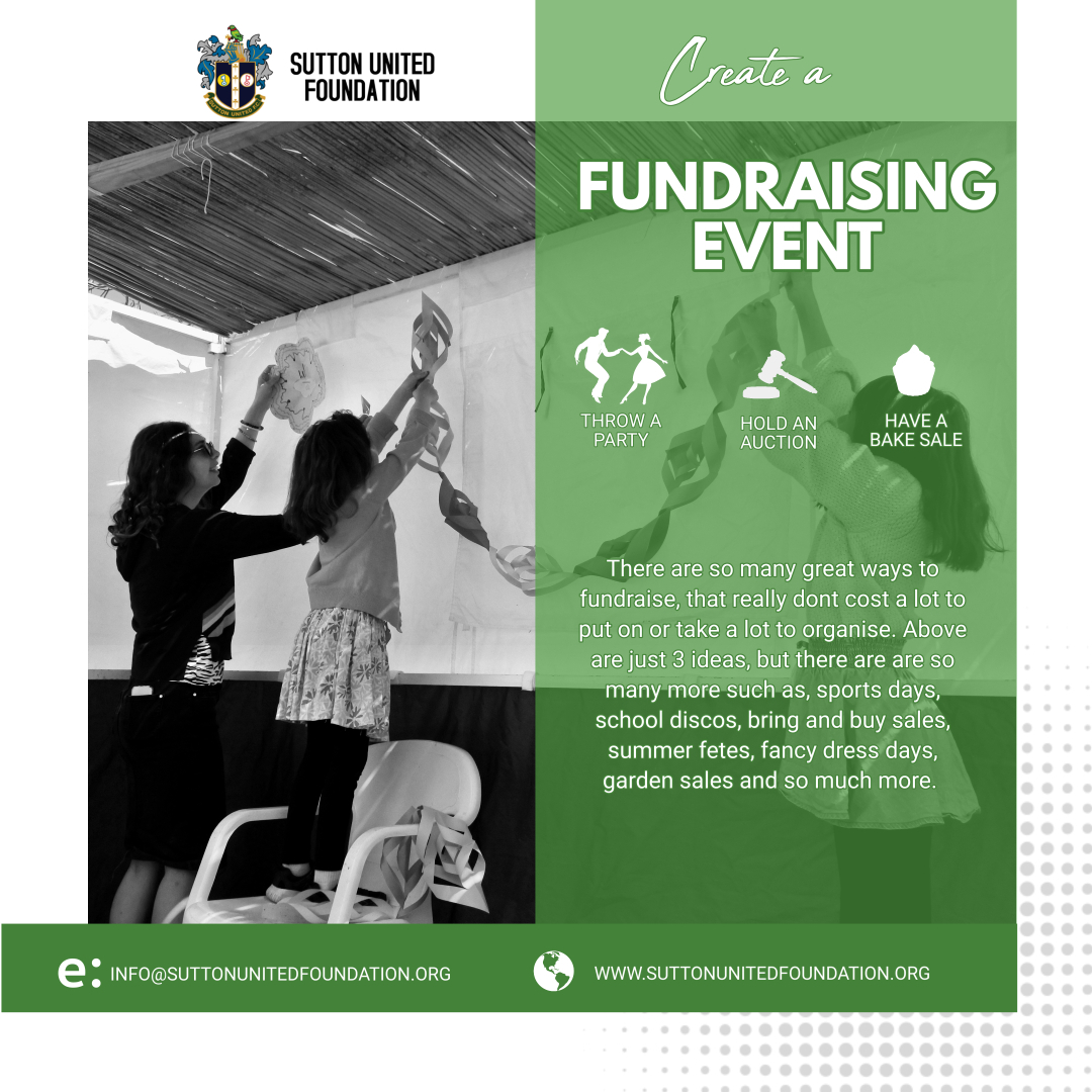 A fundraising event can be a fun and successful way to raise money for a cause. Popular options include themed parties like a murder mystery night, a karaoke night, or a movie night, with entry fees or donation requests. Other ideas include raffles, auctions, bake sales, and even activities like a dance-a-thon or a sports tournament. Sutton United Foundation are happy to help bring your ideas to life!