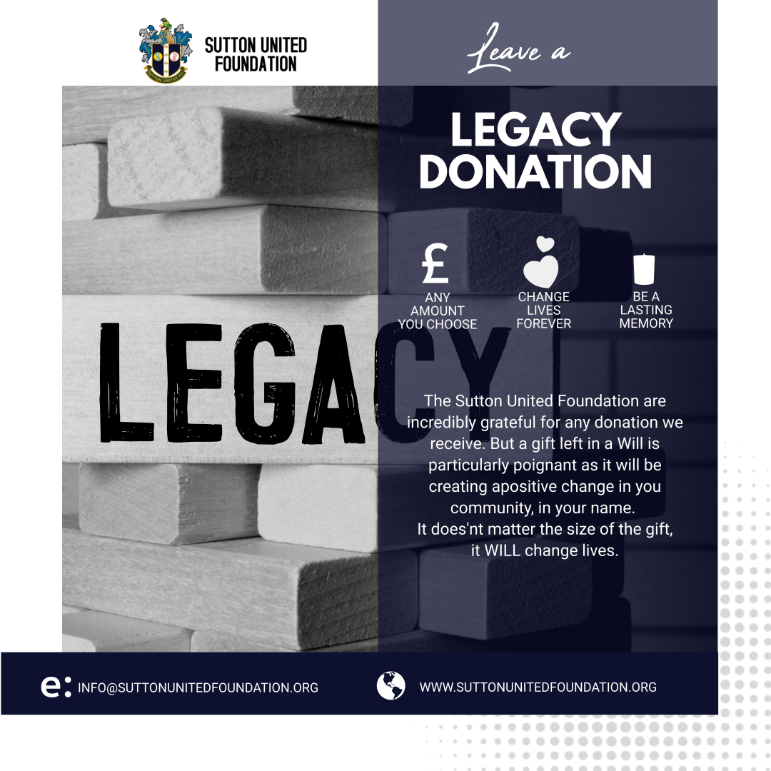 A gift in your will is a powerful way to leave a lasting legacy for your local community who will benefit from the work of the Sutton United Foundation. We know that writing a will is a deeply personal decision, and that family will always come first, but any gift you are able to leave would make a difference and enable the Foundation to continue its vital work in the local area.