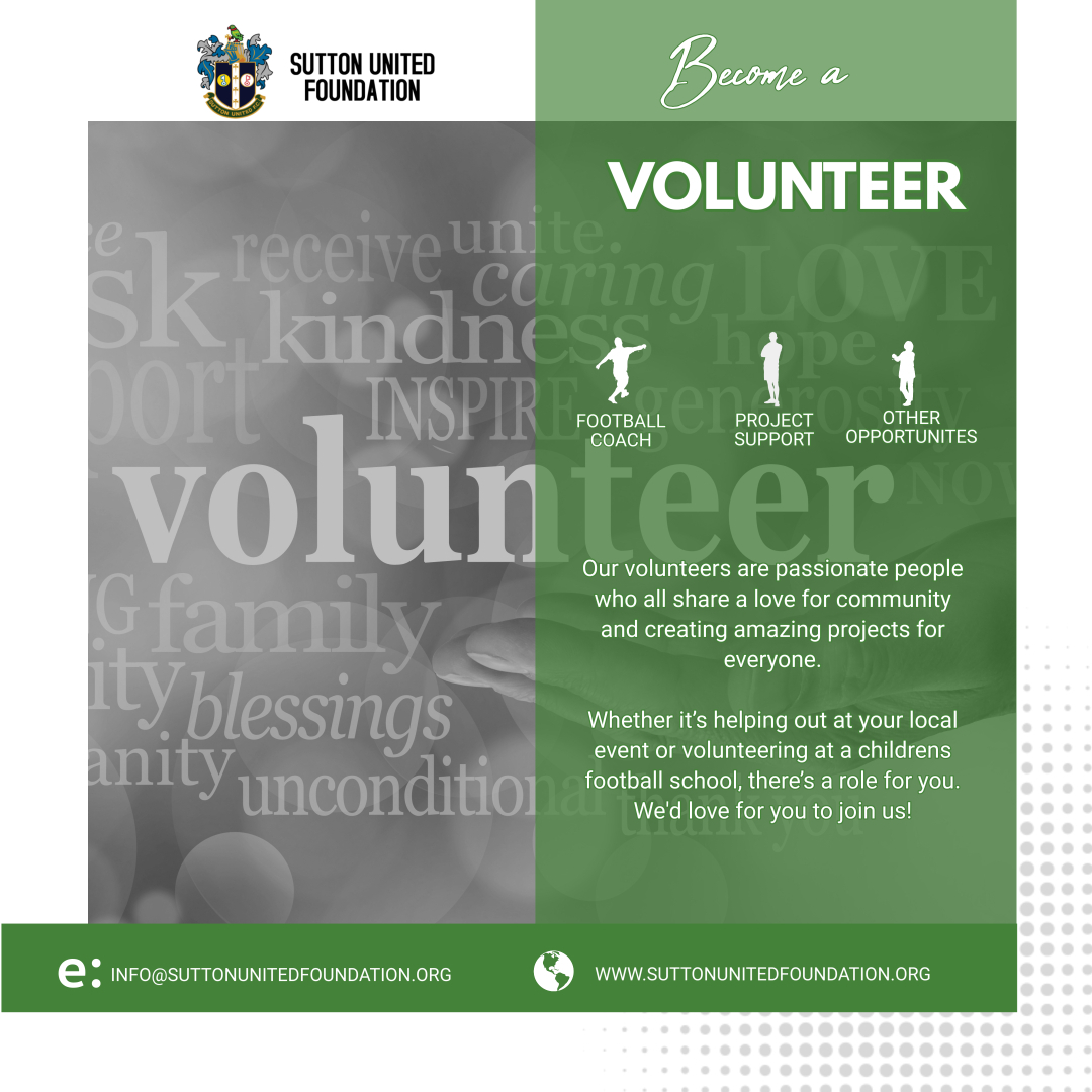 The Sutton United Foundation rely on amazing volunteers for help when holding our courses, creating worthwhile community projects, establishing new and exciting initiatives and of course within our trustee team. Also volunteers are invaluable when wonderful events happen, utilising skills for for flyering, manning stalls, and fundraising. Could this be you?